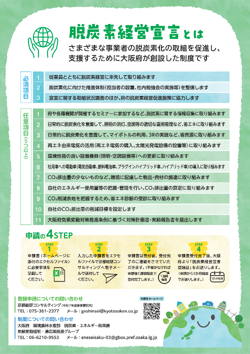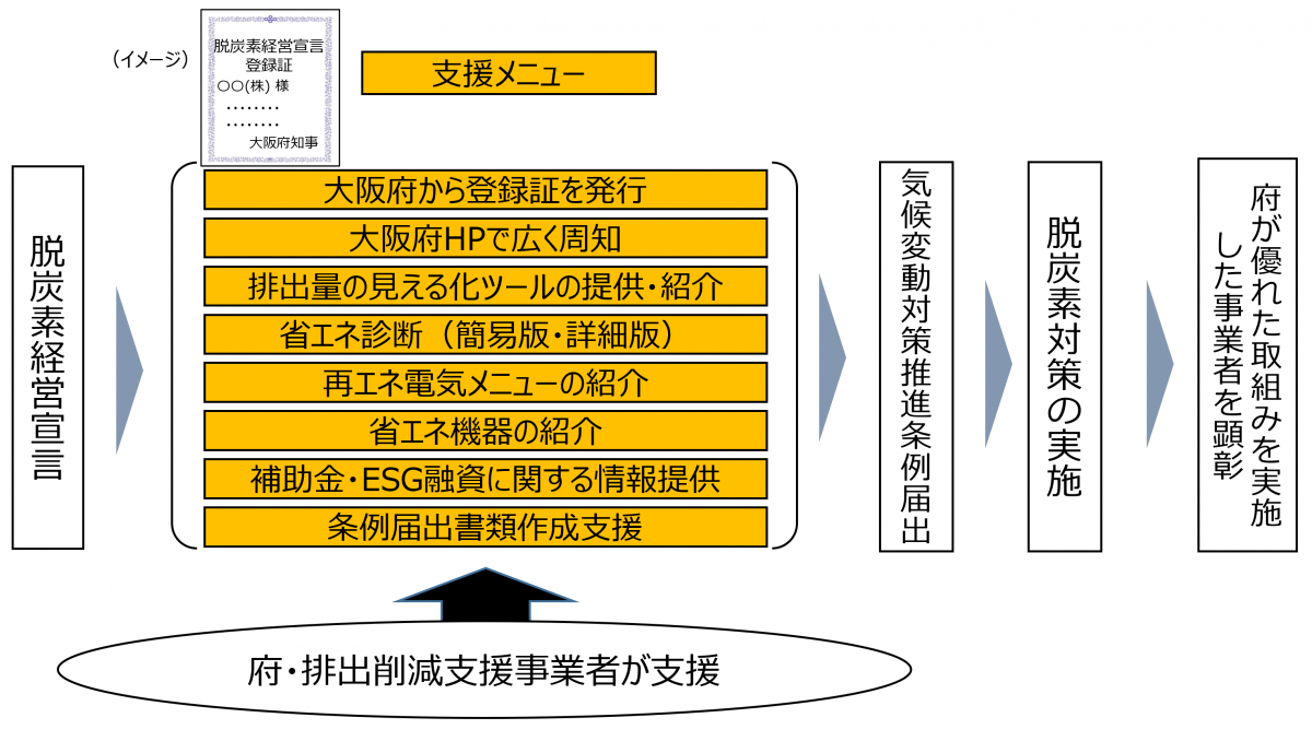 脱炭素経営を宣言した事業者に対して、大阪府が脱炭素経営宣言登録証を発行するとともに、HP等により広くPRすることのほか、排出削減支援事業者と連携して、それぞれの事業者の取組状況に応じた最適な各種支援を行うことにより、事業者の脱炭素経営を促進しています。