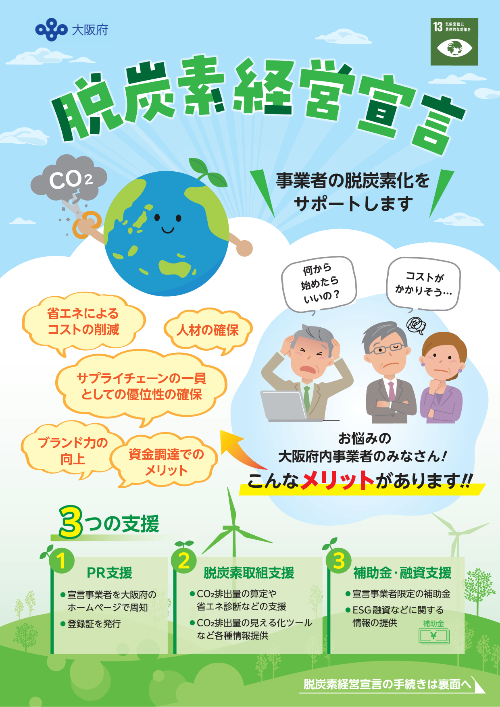 大阪府では、脱炭素化を促進するセミナーの開催等を通じて脱炭素経営宣言登録制度の周知を行うとともに、商工会議所や地域の金融機関等の関係機関と連携して、脱炭素経営宣言の働きかけを行っています。