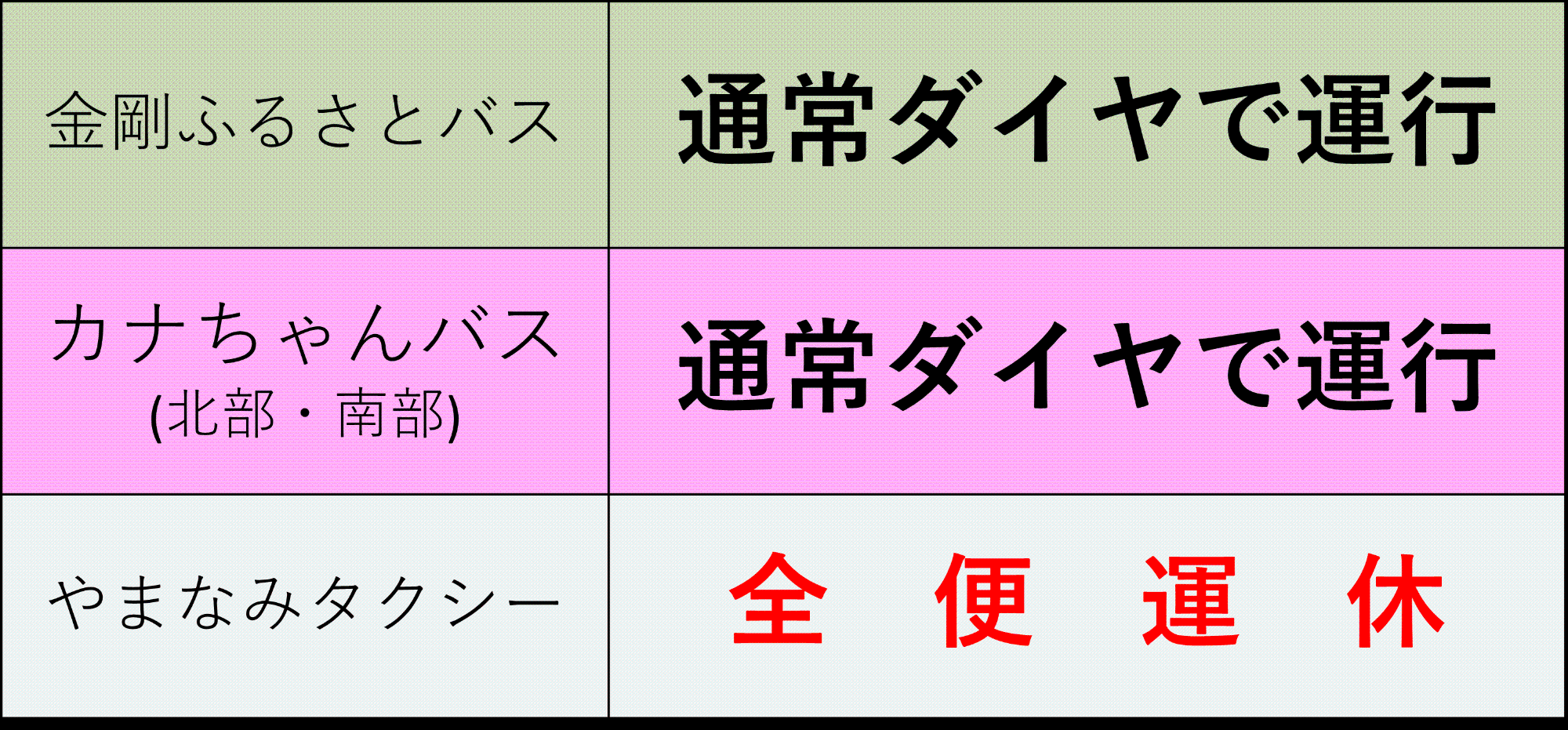 金剛ふるさとバス・カナちゃんバス・やまなみタクシーの年末年始運行情報について、お知らせします。